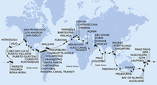 Zastávky na pevnine sú v priemere dlhšie ako tie zvyčajné - až do 13 hodín v každom prístave. Súčasťou tejto výnimočnej plavby sú aj 4 dni v Polynézii, 3 dni na Havaji a v San Franciscu a 2 dni v Los Angeles.