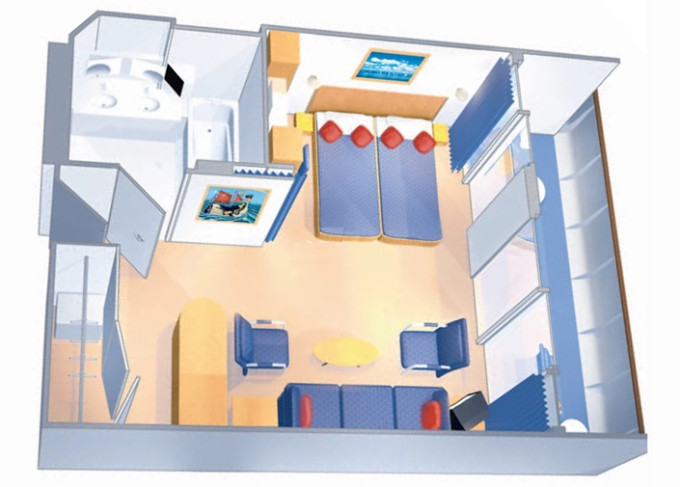 | 4U - Vnútorná kajuta s virtuálnym balkónom 15 m². Obrazovka veľkosti balkónových dverí s premietaným výhľadom. Umiestnenie vpredu / vzadu. Max 2 osoby. | 1 682 € 841 € za osobu | ||