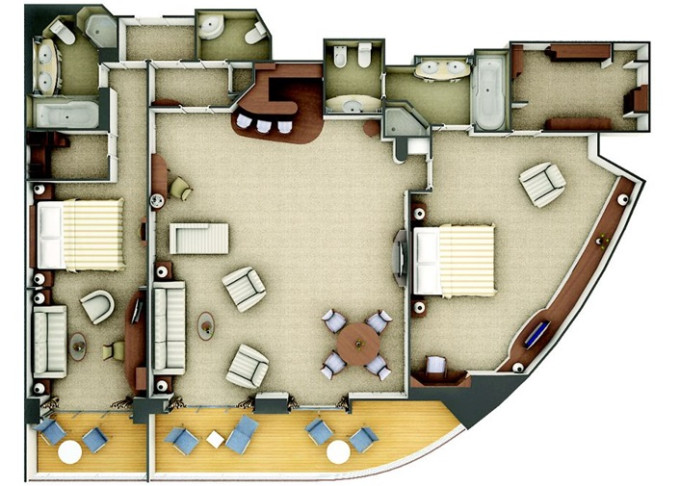 R2 - Royal Suite 2 105-110 m² + balkón 16-17 m². Royal Suite R1 spojená s Veranda Suite. 6,7. paluba vpredu. Max 5 osôb. 38 200 € 38 200 € za osobu