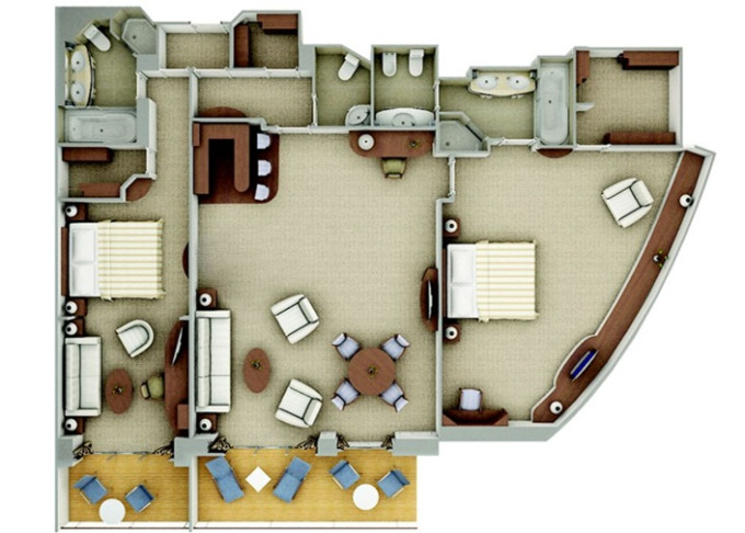 R2 - Royal Suite 2 105-110 m² + balkón 16-17 m². Royal Suite R1 spojená s Veranda Suite. 6,7. paluba vpredu. Max 5 osôb. 57 300 € 19 100 € za osobu