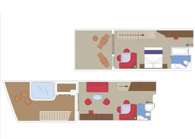 | YCD - Yacht Club Duplex Suite 46 m² + balkón 6 m². 2 podlažia, 2 kúpeľne (1 s vaňou) Max 4 osoby. 16. paluba. Cenový model MSC Yacht Club. | 6 982 € 3 491 € za osobu | ||